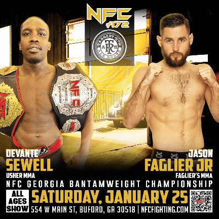 Stream NFC #172 live and catch all the thrilling fight action. We will be streaming from Tannery Row Alehouse in Buford, Georgia on Saturday, January 25. The battles begin at 6 PM.