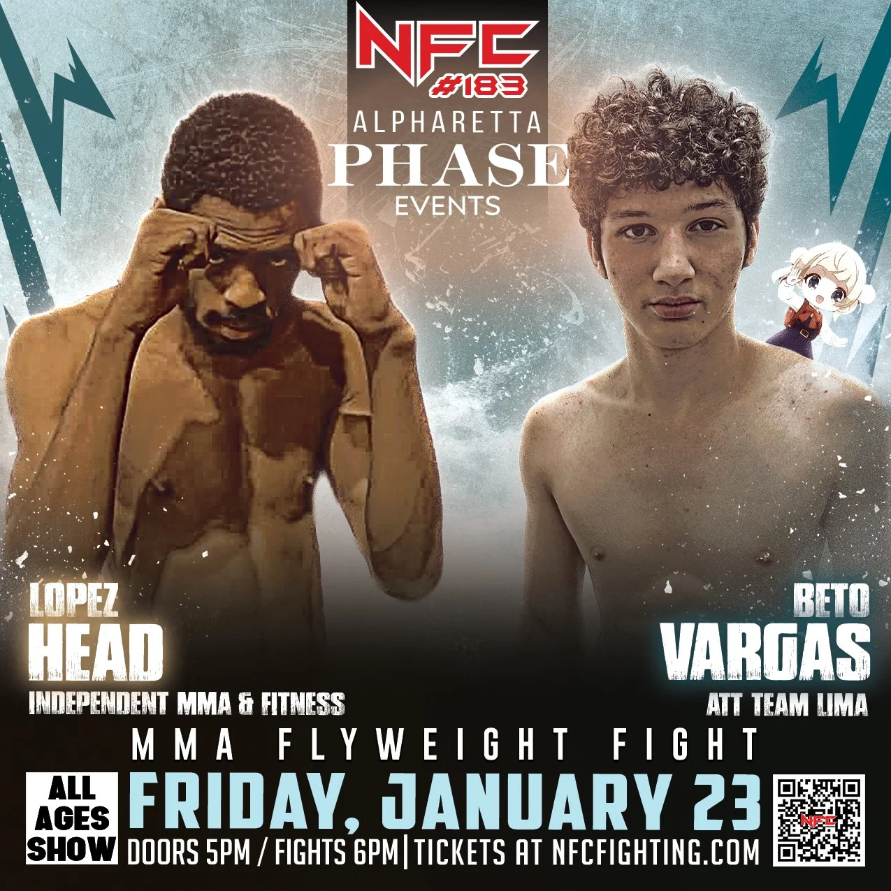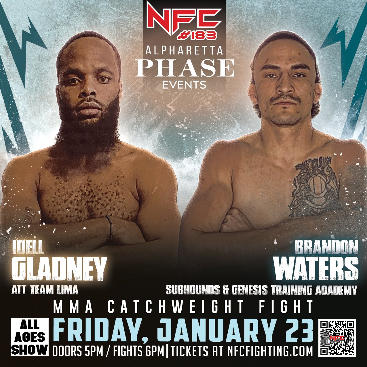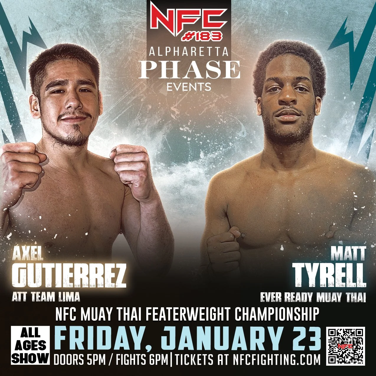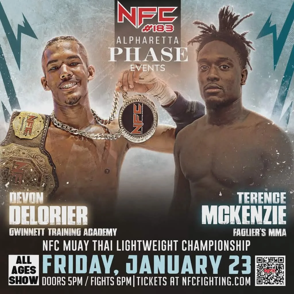We’re back in Alpharetta, Georgia for the first fight night of 2026! NFC #183 takes over Phase Events on Friday, January 23 with an explosive lineup of MMA, Muay Thai, and Boxing matchups. Get ready for a night packed with high-intensity action, heart-pounding moments, and a crowd that brings the energy.