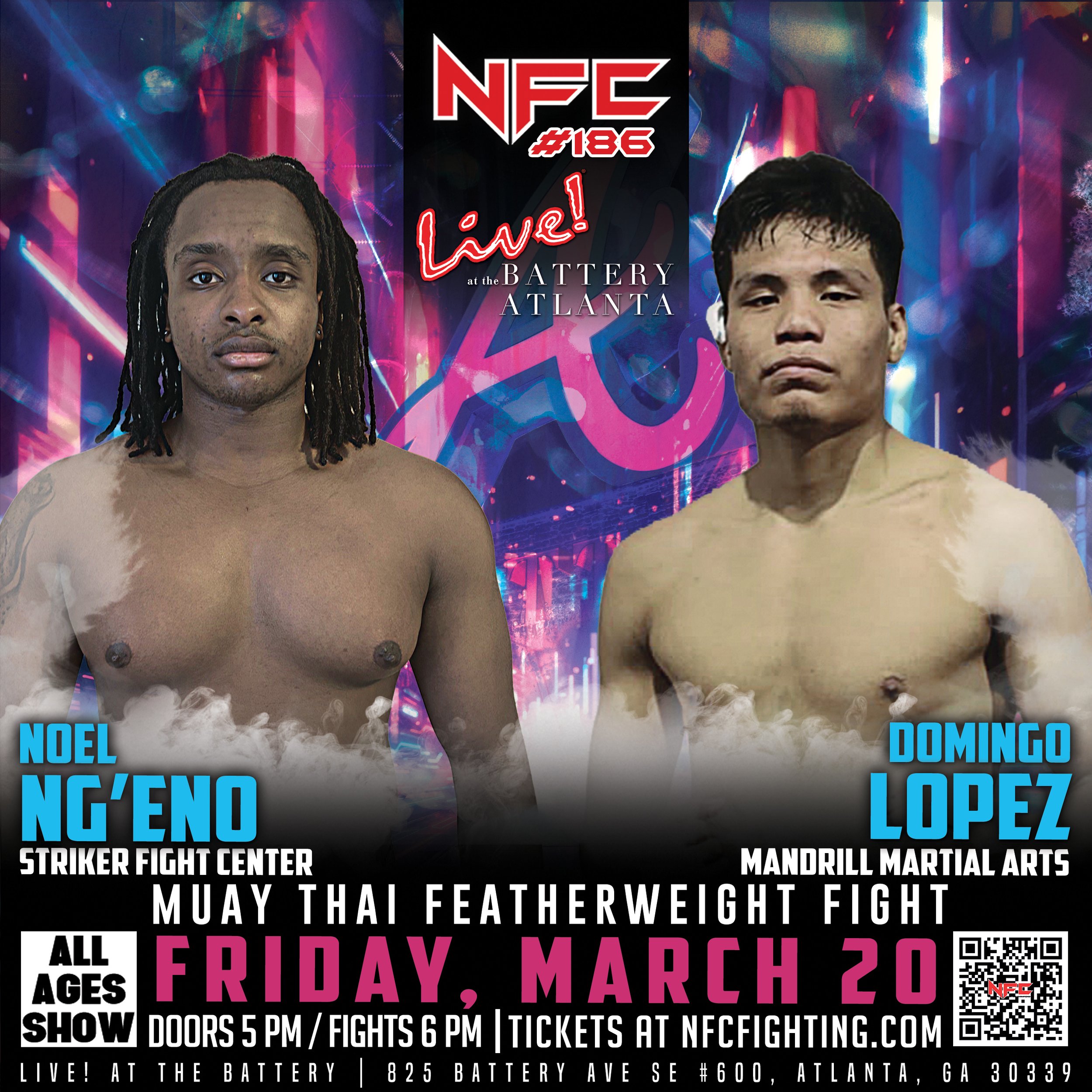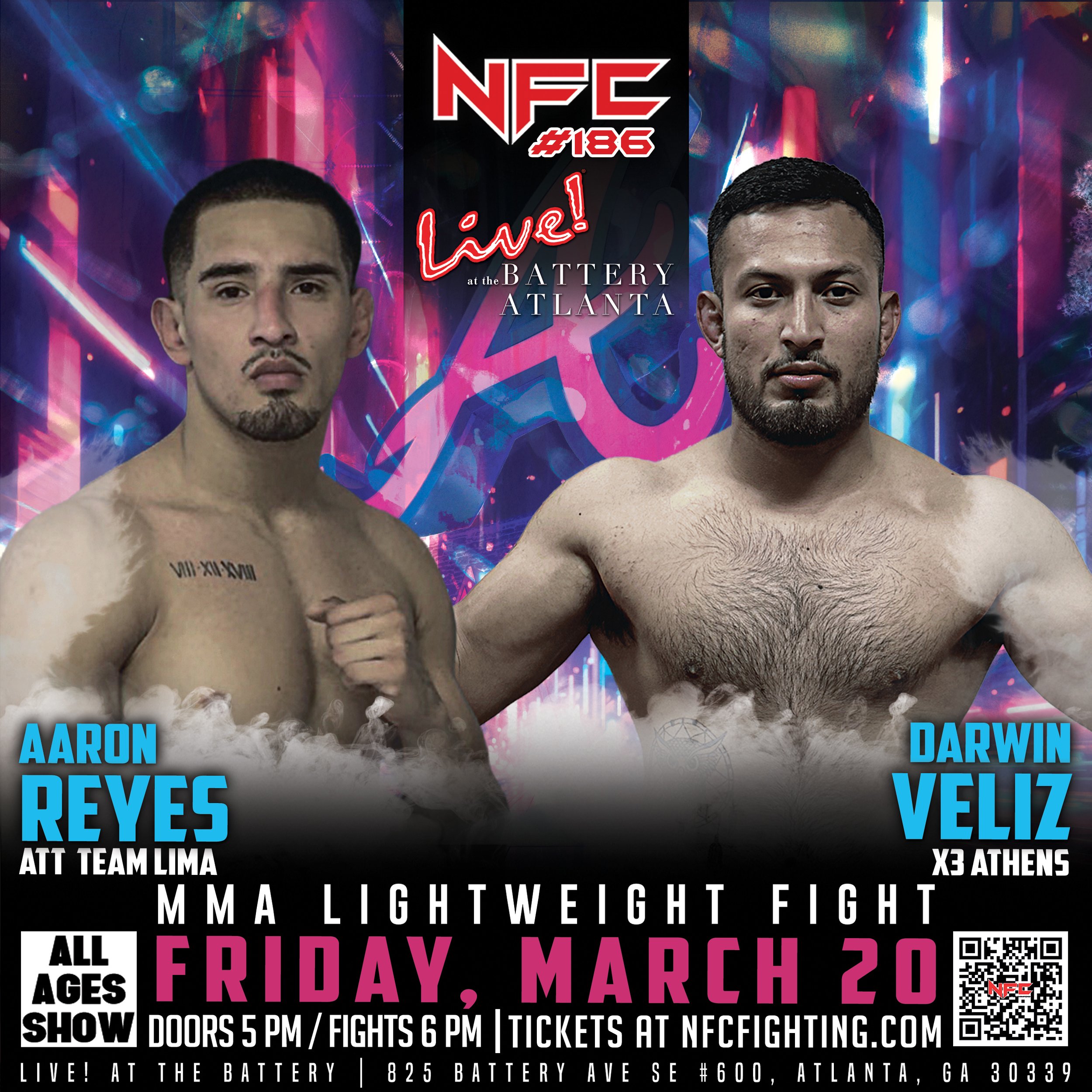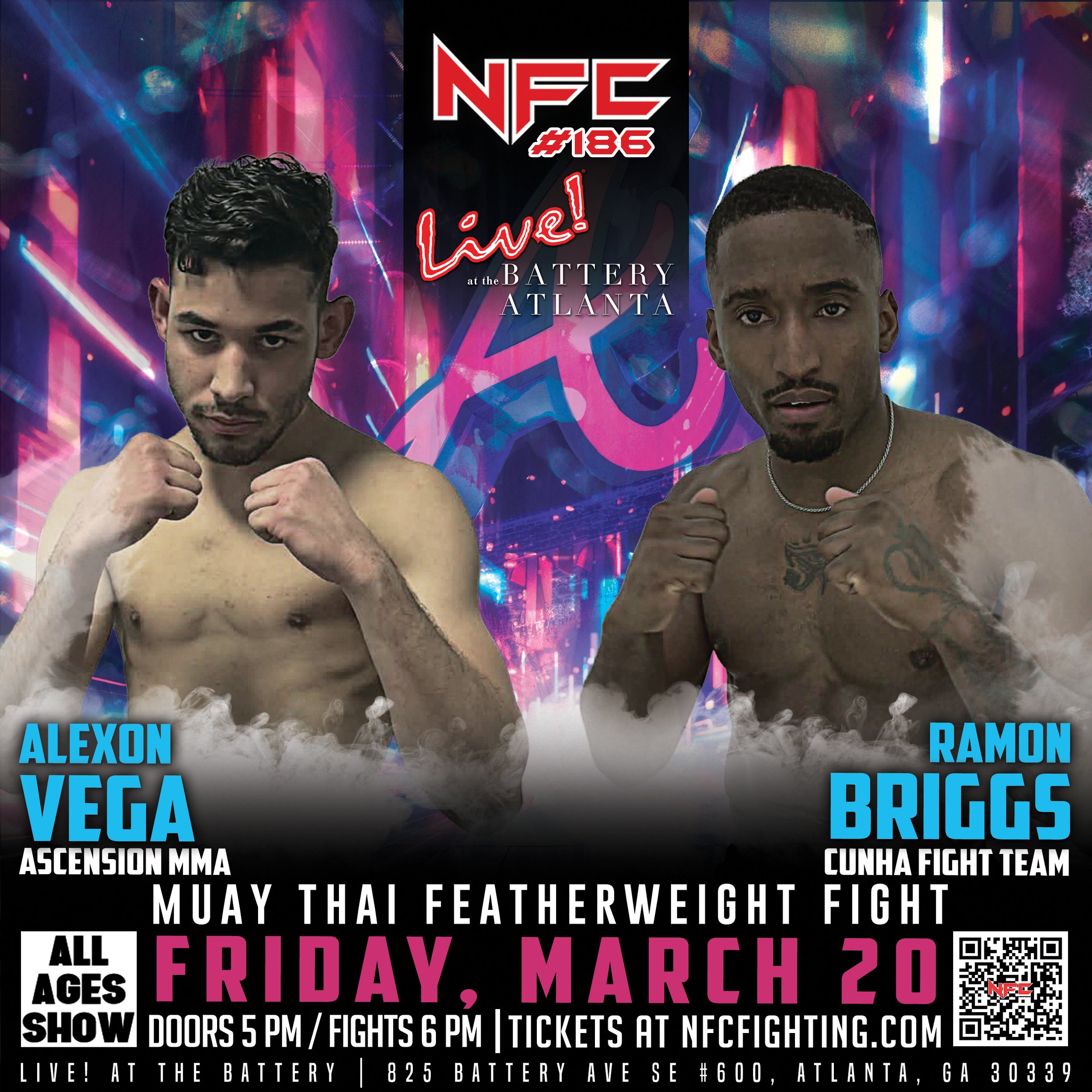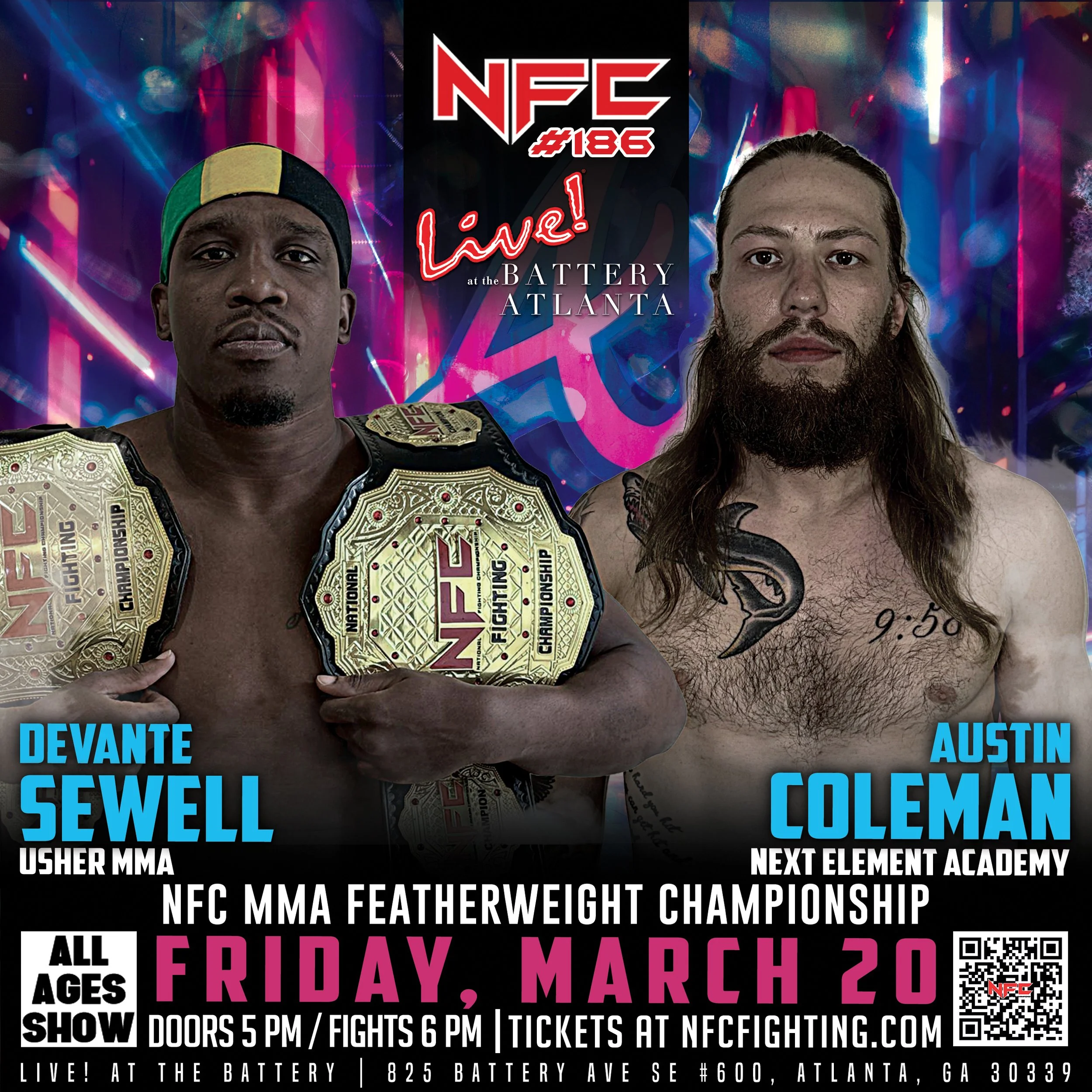 Stream NFC #186 live and catch all the thrilling fight action. We will be streaming from Live at the Battery in Atlanta, GA on Friday, March 20 at 6 pm.