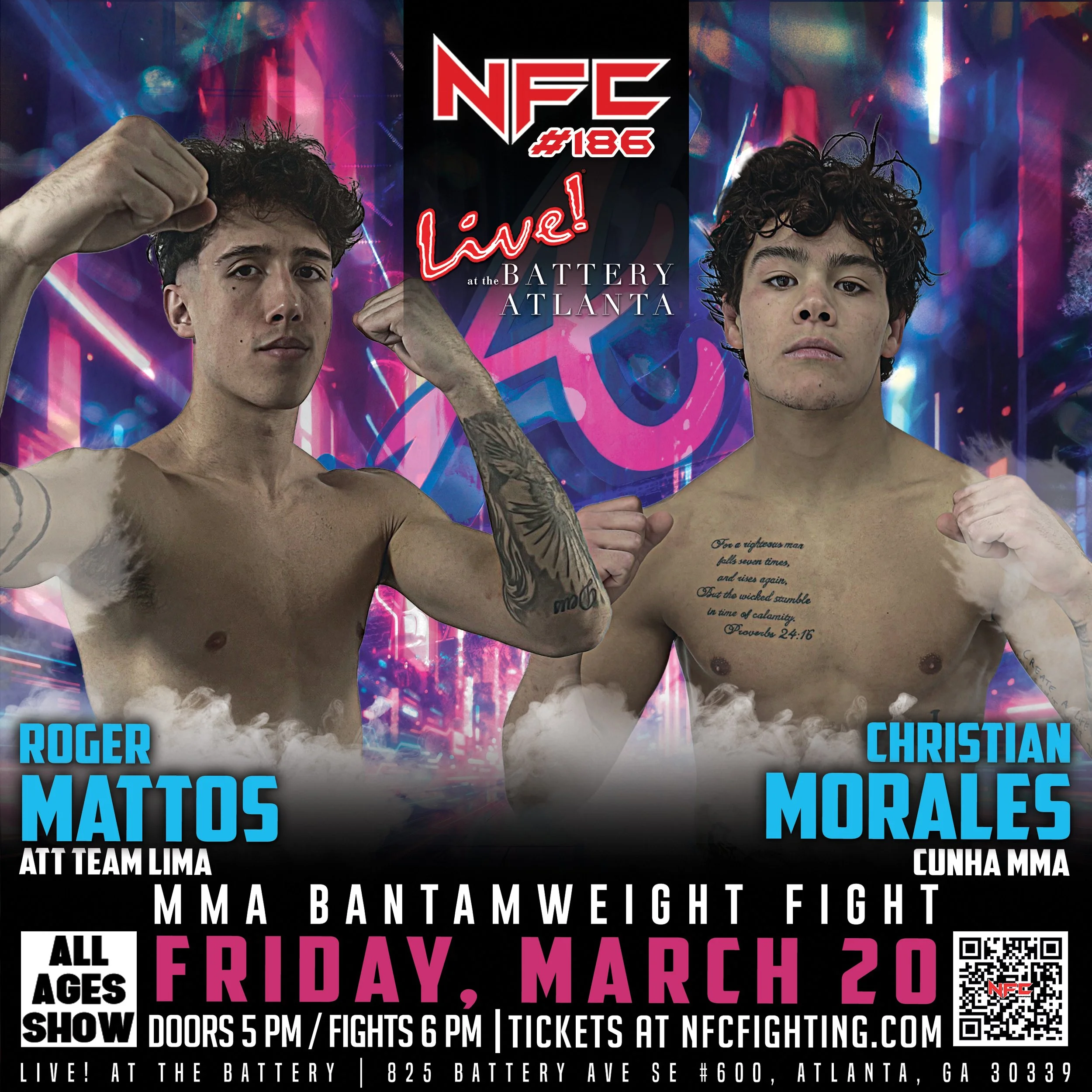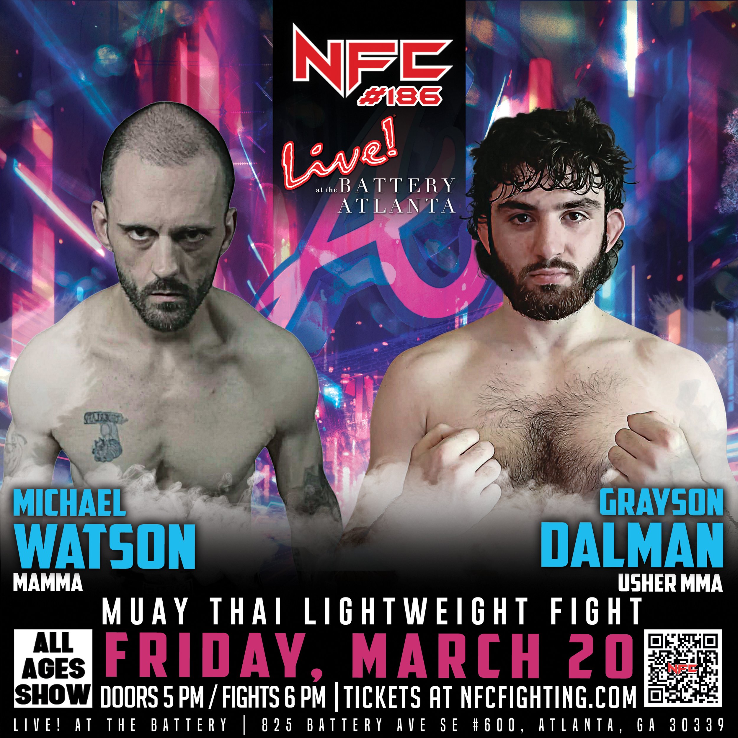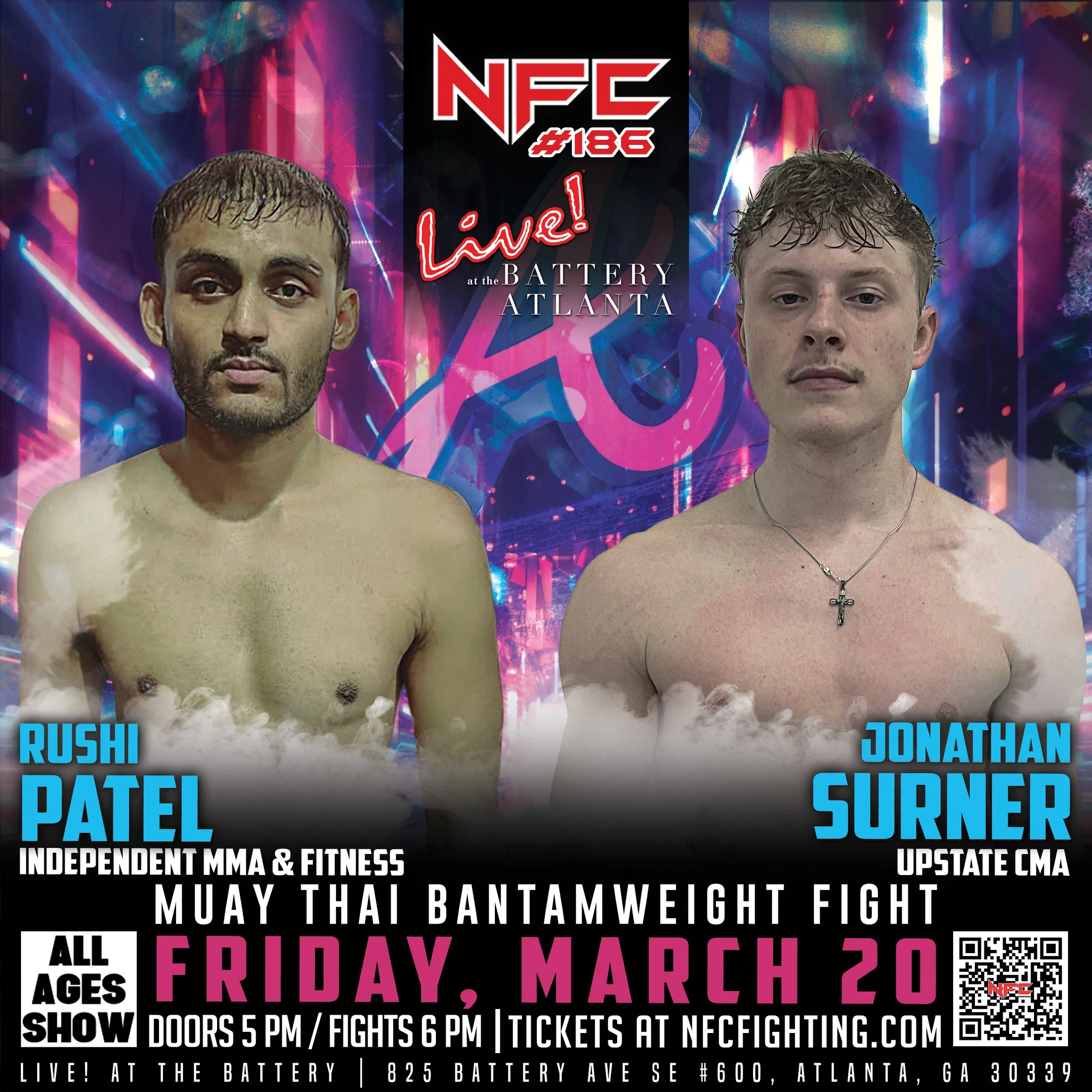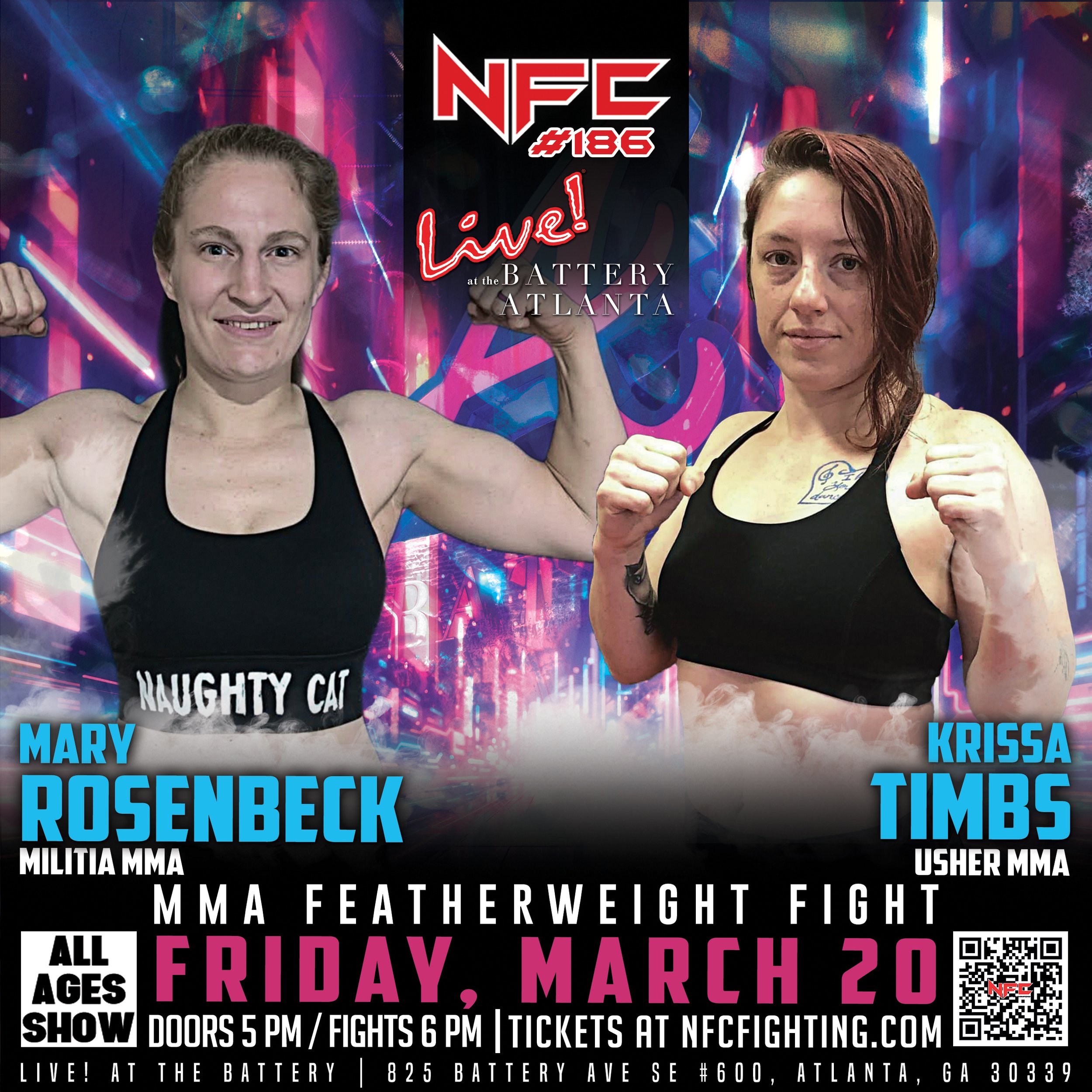 Stream NFC #186 live and catch all the thrilling fight action. We will be streaming from Live at the Battery in Atlanta, GA on Friday, March 20 at 6 pm.