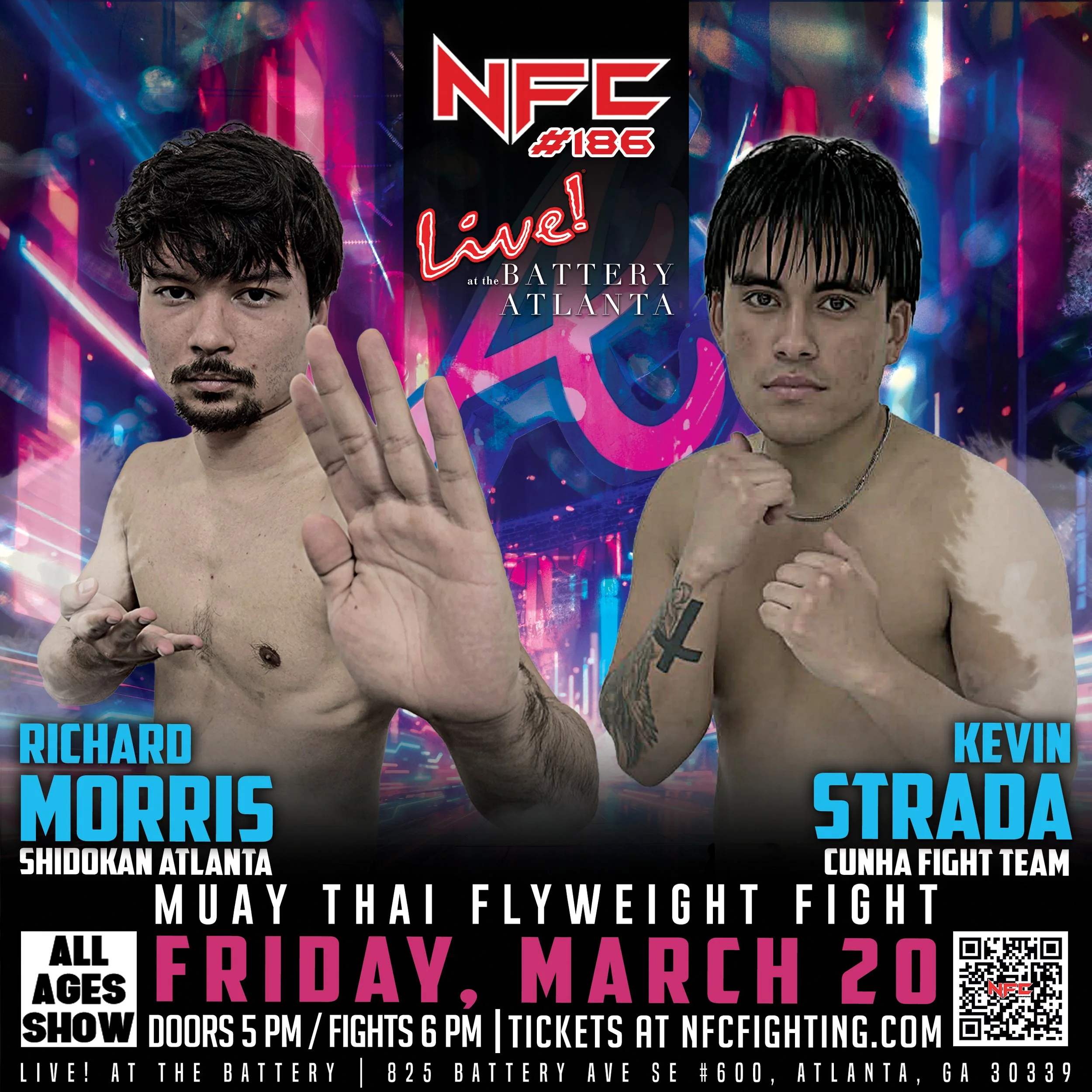 NFC returns to Live! at the Battery for our first fight night in 2026! Join us for an action-packed evening of live professional and amateur MMA and muay Thai fights right next to the Braves Stadium!